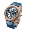 Arena case in platinum, blue lacquered dial, jumping hours in an aperture at 12h, retrograde minutes sweeping a 210° sector, retrograde date at 6h, self-winding movement.