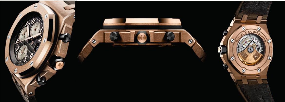 Precious metals and a game of contrasts bring new character to the Royal Oak Offshore. Pink on grey: 18-carat pink gold case harmonises with a grey alligator bracelet