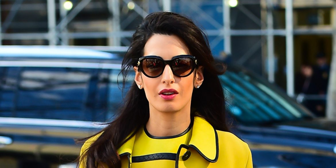 Amal Clooney wore Bottega Veneta Cruise Velvet Devore Dress and Cashmere Coat in Dusty rose, carrying a Bottega Veneta Roma Handbag in New York City.