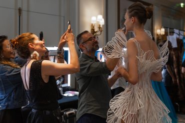 After more than 450 hours of work, 33-pieces of eco-friendly TPU material, and tulle gathered meticulously with the pieces, a 3D printed gown blossomed at Tony Ward.