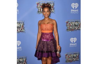 Actress Anika Noni Rose looked beautiful at the premiere of «Everything, Everything» in a Georges Chakra strapless orange, purple, and plum