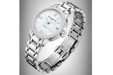 Montre en acier poli serti de 60 diamants taille brillant, diamètre 31 mm. Cadran en nacre, chiffres romains et index.