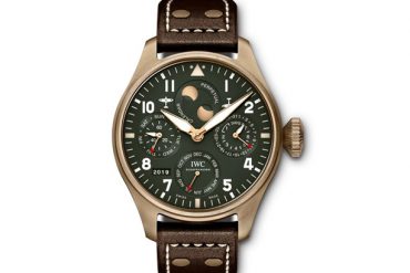 Le boîtier en bronze, le cadran vert olive et le bracelet en cuir de veau brun confèrent à cette Montre d’Aviateur à complication un caractère unique. Avec le temps, le bronze acquiert une patine caractéristique.